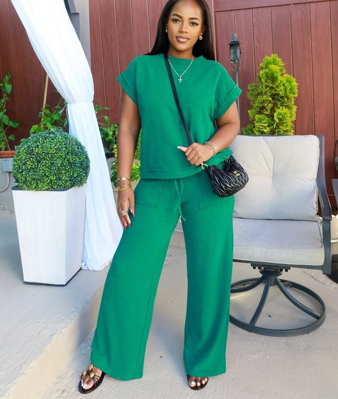SOLID COLOR PATTERN CAP SLEEVES OVERSIZED FIT AND PANT SET WITH DRAWSTRING DETAIL. HAS STRETCH.